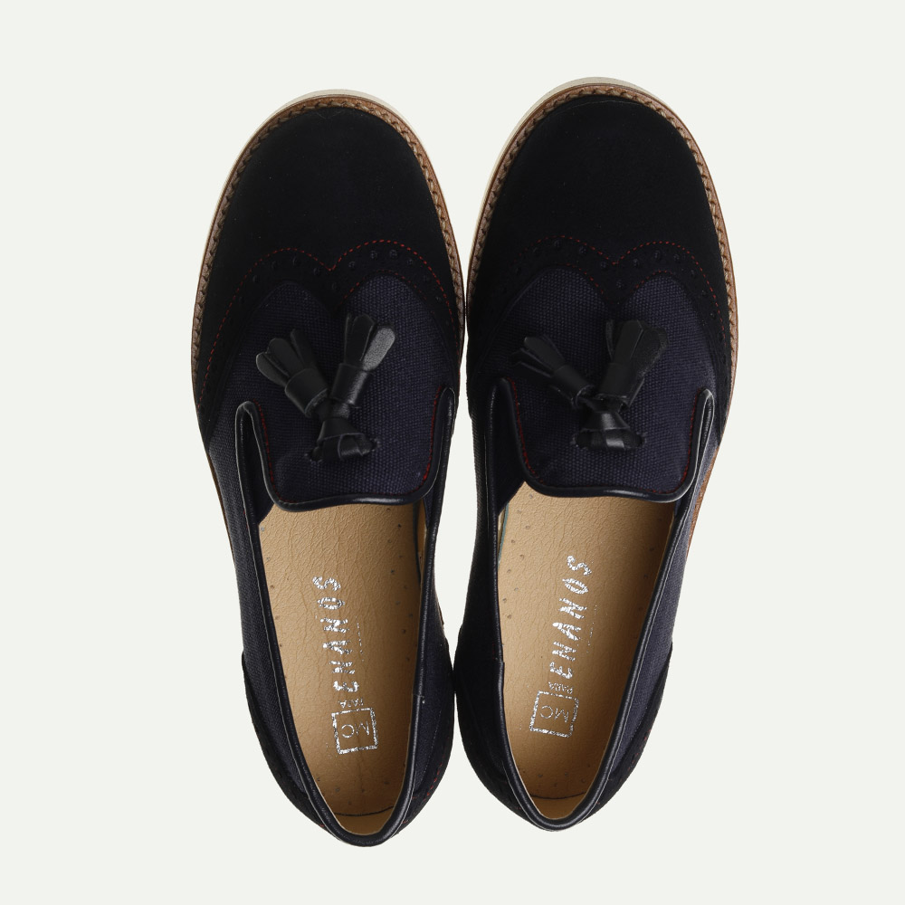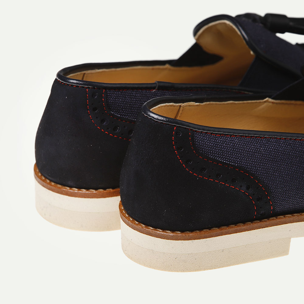 Zapato comunión niño tipo mocasín. Estilo clásico ideal para dar ese toque elegante en ocasiones especiales como bautizos, bodas, eventos familiares y comuniones. Fabricado en ante y lino de color marino. Pespuntes en rojo. Elástico interior. Adorno con moñas hecho a mano. Fabricado íntegramente en España con materiales de alta calidad, incluye una plantilla acolchada y piso de goma para ofrecer la mayor comodidad a los más pequeños. Comodidad y elegancia para un día especial.