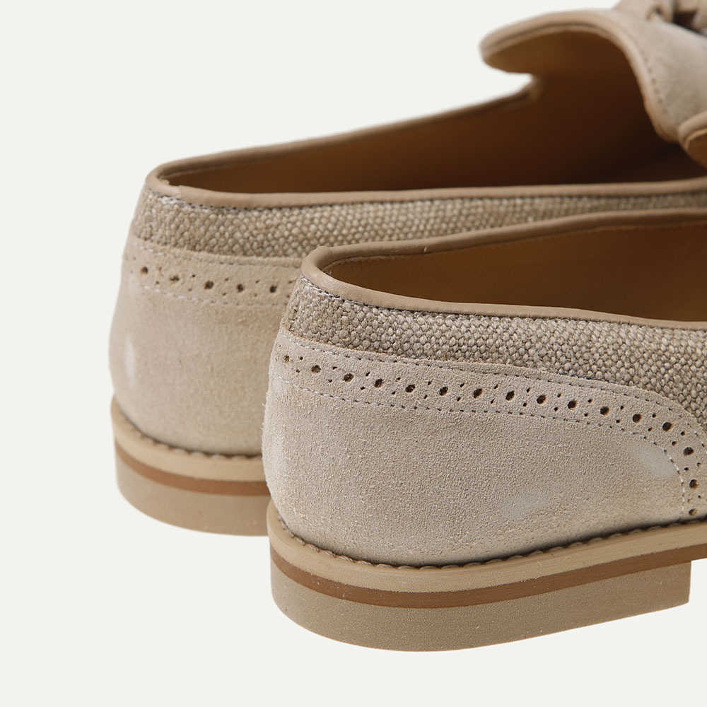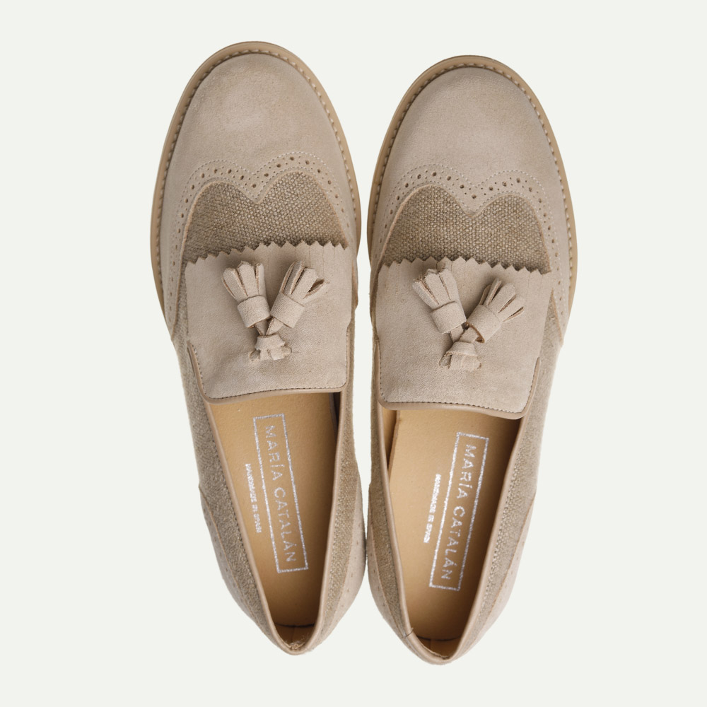 Zapato comunión niño tipo mocasín. Estilo clásico ideal para dar ese toque elegante en ocasiones especiales como bautizos, bodas, eventos familiares y comuniones. Fabricado en ante marino, ante taupe y lino yute. Adorno con moñas hecho a mano. Fabricado íntegramente en España con materiales de alta calidad, incluye una plantilla acolchada y piso de goma para ofrecer la mayor comodidad a los más pequeños. Comodidad y elegancia para un día especial.