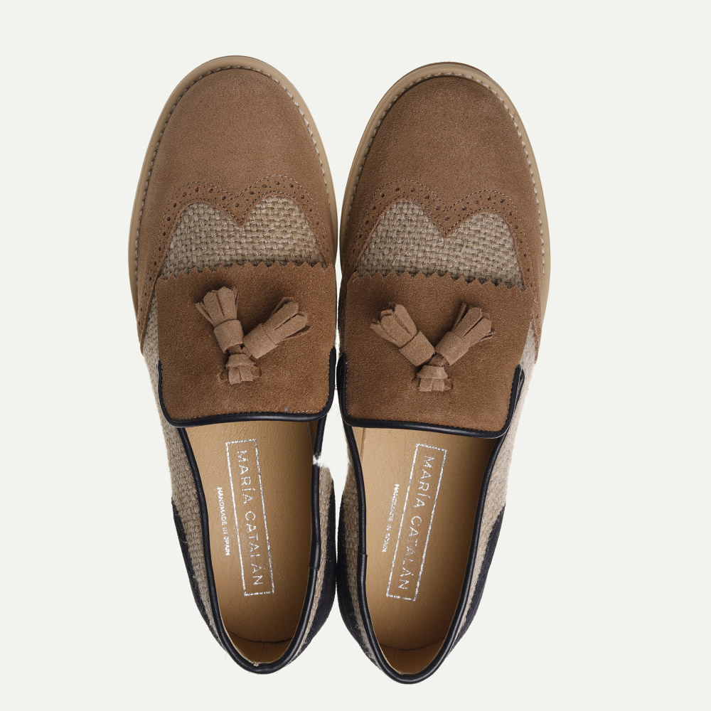 Zapato comunión niño tipo mocasín. Estilo clásico ideal para dar ese toque elegante en ocasiones especiales como bautizos, bodas, eventos familiares y comuniones. Fabricado en ante marino, ante taupe y lino yute. Adorno con moñas hecho a mano. Fabricado íntegramente en España con materiales de alta calidad, incluye una plantilla acolchada y piso de goma para ofrecer la mayor comodidad a los más pequeños. Comodidad y elegancia para un día especial.