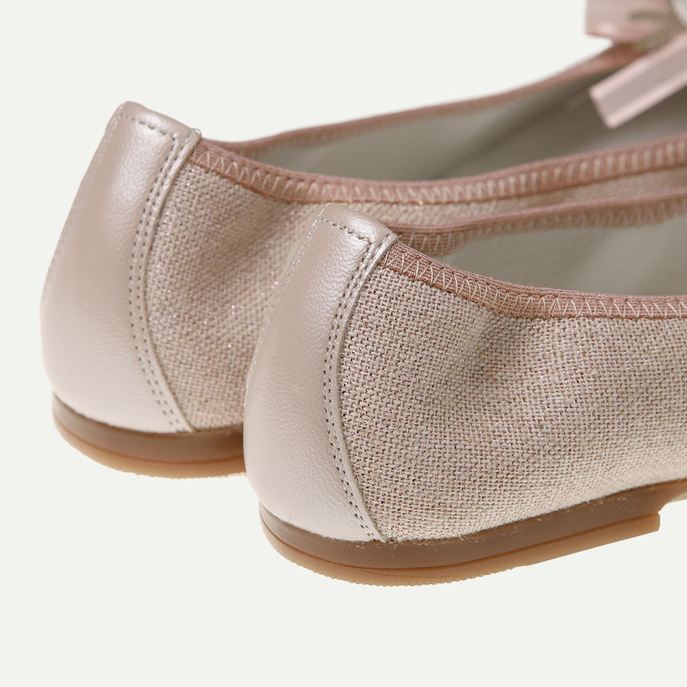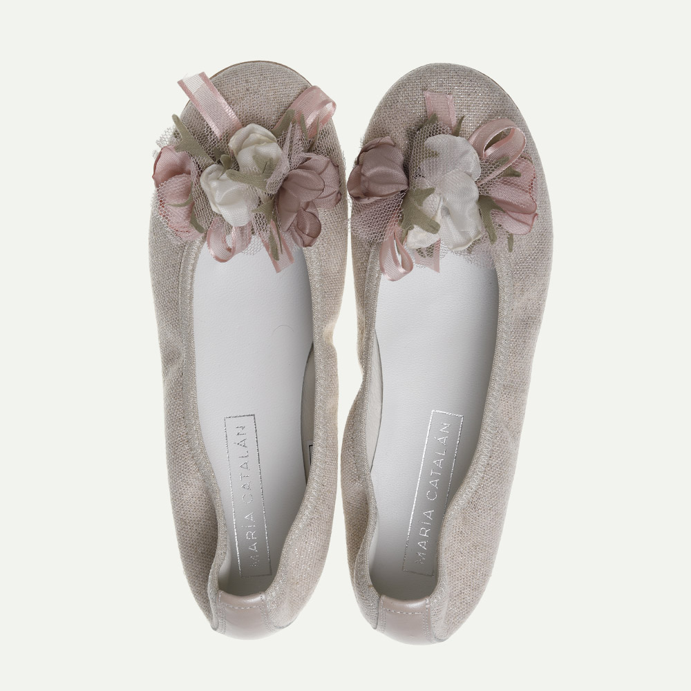 Zapato de niña especial comunión tipo bailarina fabricada en lino rosa con toques brillantitos. Para mayor sujeción, se ha diseñado con el vivo elástico al tono. Piso de goma flexible, ligero y cómodo. Con adorno floral hecho a mano. Fácil de combinar, tanto con vestido, falda o pantalón. Todos los zapatos incluyen una plantilla acolchada y piso de goma. Calzado fabricado a mano en nuestras instalaciones de Villena (Alicante) España.