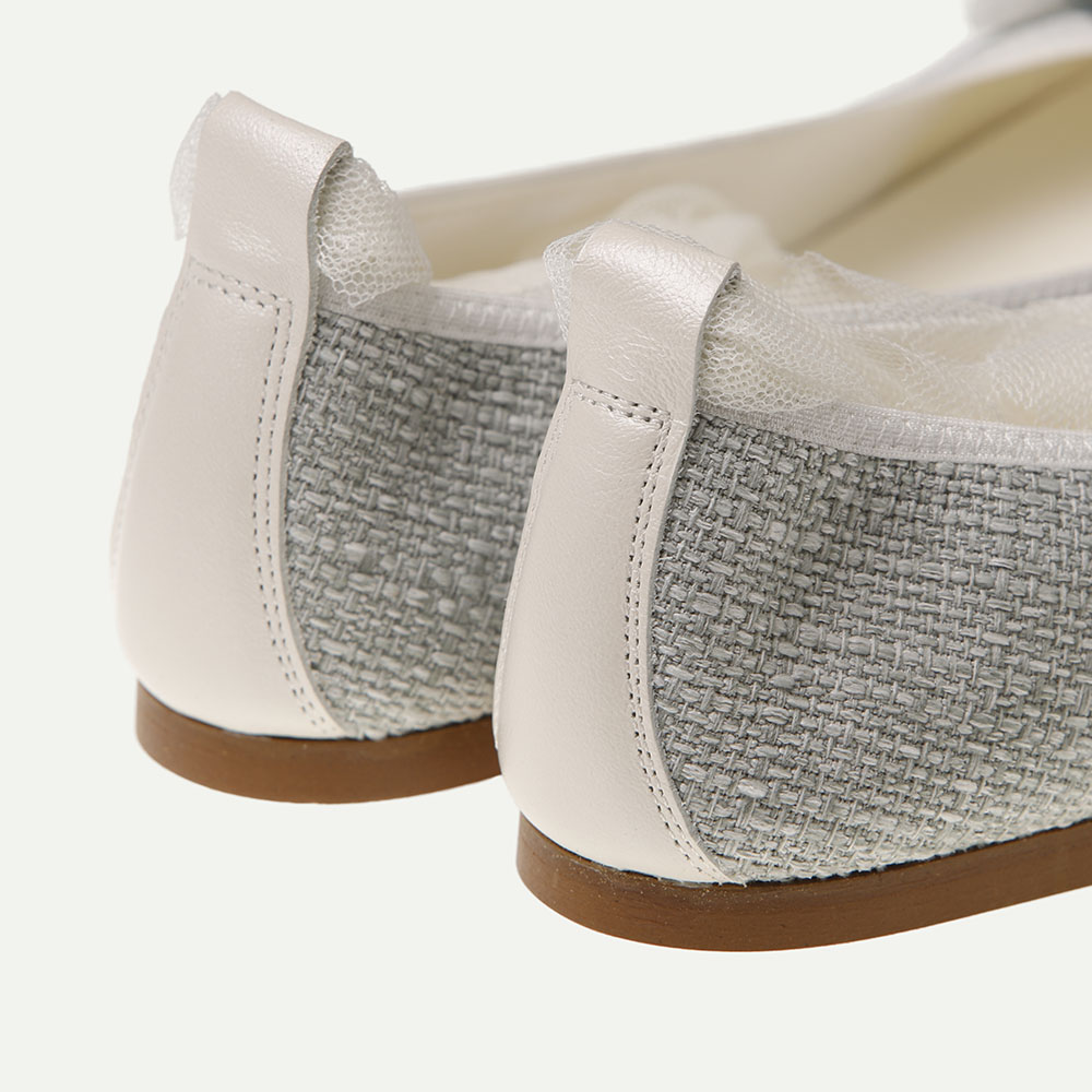 Zapato Comunión niña de estilo bailarina con puntera cuadrada, fabricado en lino verde agua. Pieza puntera y talón en piel nacarada color blanco roto. Adorno floral hecho a mano en tono crudo y verde. Cinta de tul al tono para atar al tobillo que garantiza total seguridad al andar. Es perfecto para combinar con vestidos, pantalones o faldas, tanto en las ocasiones más especiales, bautizos, bodas, comuniones… como para los fin de semana. Fabricado íntegramente en España con materiales de alta calidad, incluye una plantilla acolchada y piso de goma para ofrecer la mayor comodidad a los más pequeños. Comodidad y elegancia para un día especial.