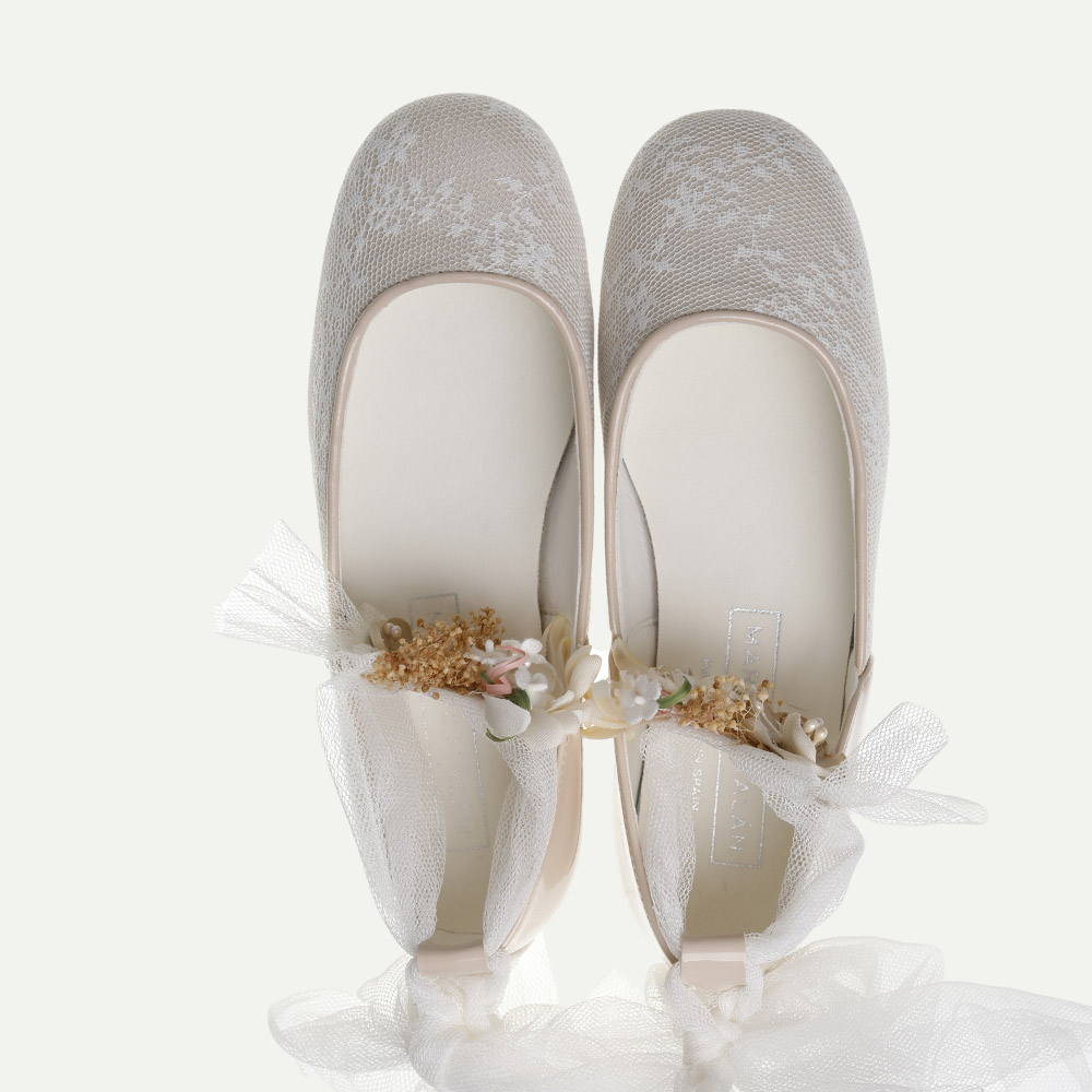 Zapato de niña de estilo Bailarina perfecto para celebrar su Primera Comunión, o eventos como bautizos y bodas . Fabricado raso color hielo con encaje encima y con talón alto en charol al tono. Adorno floral en color crudo, hecho a mano. Cinta de tul para atar al tobillo. Nuestras bailarinas cuentan con plantillas acolchadas y suela de goma. Es perfecto para combinar con vestidos, pantalones o faldas, tanto en las ocasiones más especiales como para los fin de semana. Todos nuestros modelos se fabrican a mano en nuestras instalaciones de Villena (Alicante) España. Elegimos materiales de primera calidad de proveedores de la zona, diseñando cada modelo pensando en los más pequeños de la casa, ofreciendo calzado de calidad a la última.