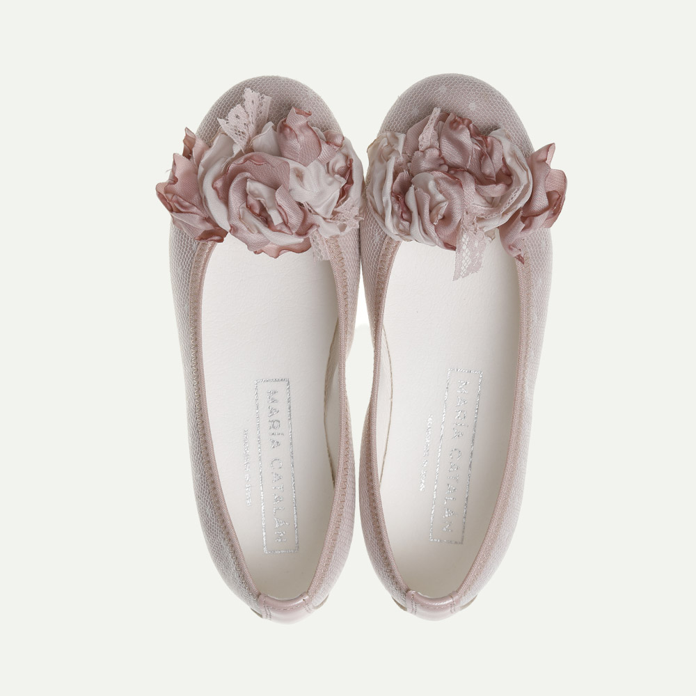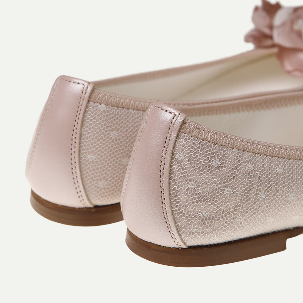 Zapato de niña estilo bailarina. Colección especial ceremonia, ideal para ocasiones especiales, como bodas, bautizos o su Primera Comunión. Fabricado en plumeti de topos sobre raso en color maquillaje. Adorno de flores en color rosa empolvado, elegido con mimo y delicadeza. Nuestras plantillas especiales acolchadas y la suela de goma aportan un máximo de comodidad. Todos nuestros modelos se fabrican a mano en nuestras instalaciones de Villena (Alicante) España.